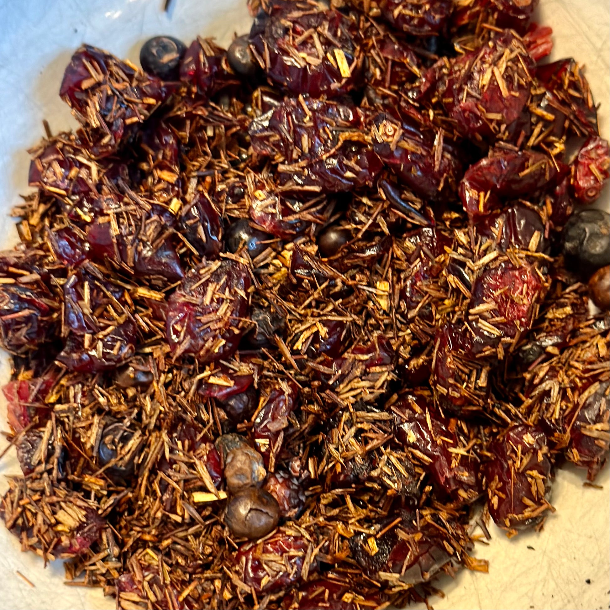 dried cranberries, dried strawberries, juniper berry, rooibos, red rose petals, hibiscus