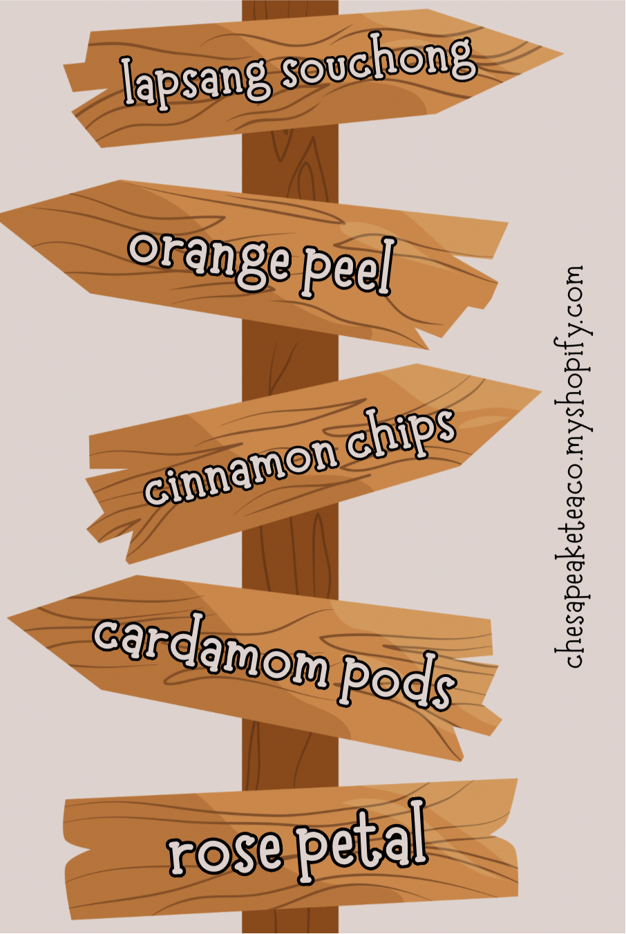 Lapsang souchong (smoked black tea), orange peel, cinnamon chip, cardamom pods, rose petals