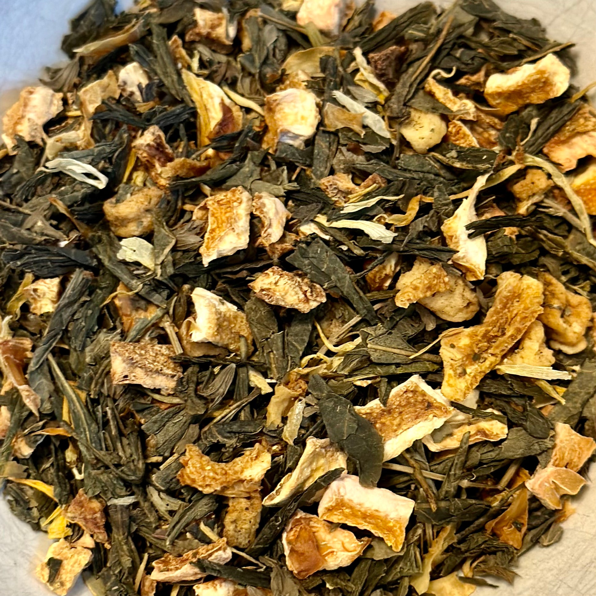 lemon peel, green tea, lemon balm, apple pieces, marigold, calendula, vanilla
